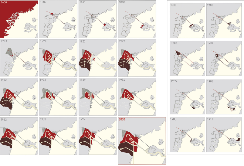 En el distrito dividido de dicha forma han sido investigadas temáticas diferentes, desde la génesis de la Operación Porto Marghera, hasta los escenarios, aceptados o negados, que se han ido sucediendo en la historia de este sitio. Han sido recolectados los planos originales de los proyectos más importantes del desarrollo del puerto al principio del siglo veinte, poniendo el enfoque sobre los profundos cambios que han sufrido los propósitos del puerto: primero la perspectiva sobre la expansión del puerto comercial, y luego sobre las perspectivas de desarrollo de un puerto de vocación industrial. Además, se han vuelto a hacer los planos de todos los proyectos y transformaciones que han cambiado la morfología del borde lagunar entre el 1600 y el 2000. Dichos planos nos permiten ejemplificar y “serializar” las transformaciones aclarando la entidad de los cambios desde un punto de vista morfológico y de impacto territorial. Paralelamente se han devuelto los proyectos que por alguna que otra razón no se pudieron cumplir: transformaciones versus escenarios negativos. A una primera descomposición y clasificación por forma y dimensión, sigue el muestreo de todas las naves industriales estudiadas organizándolas por familias funcionales: producción, desplazamiento y almacenamiento. Este proceso permitió comprobar la densidad de lo construido en cada área, y establecer una primera base de datos de los objetos arquitectónicos. El ábaco facilitó la organización de las diferentes áreas utilizando como parámetro, por ejemplo, la densidad. Las mismas áreas que por dimensión se clasificaban como extra-grandes resultaron extra-pequeñas considerando la cantidad de silos de almacenamiento.