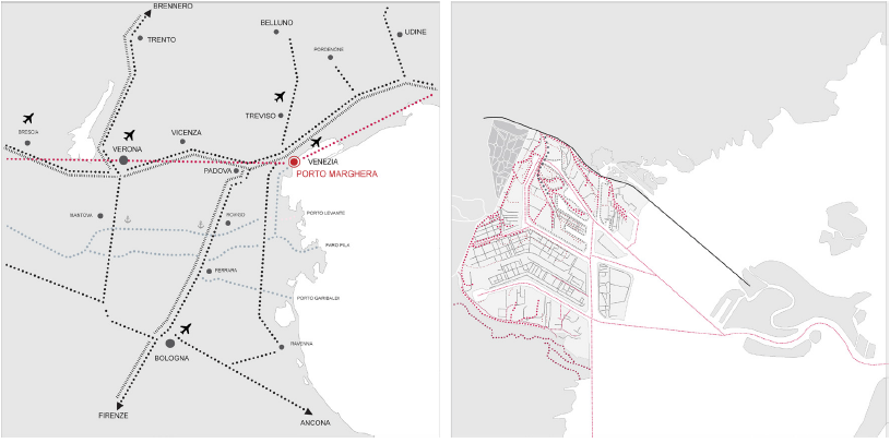 Lo que pasó en Porto Marghera no cubre solo sus inicios y su desarrollo, sino también el actual contexto geográfico, político y gubernamental en relación a la “ciudad metropolitana”. El interés estratégico de este territorio, considerado uno de los más infraestructurados de Europa8, se perfila a través de las relaciones entre el distrito industrial veneciano y el sistema de infraestructuras supralocal (Corridoio 5)9. Se trata de un sistema infraestructural de un tamaño mucho mayor de las simples fronteras de la ciudad o de la provincia de Venecia: solo hace falta tener en cuenta que el sistema aeroportuario de la ciudad es el cuarto en Italia por carga y el tercero para trayectos y pasajeros después de los aeropuertos de Roma y Milán.
