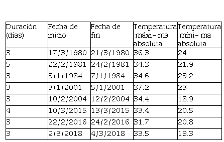 En la Tabla 1 se muestran las olas de calor ocurridas en el semestre cálido octubre 1961-marzo 2018 para Mar del Plata. En este periodo se han registrado nueve eventos de olas de calor. Los más destacables, por su duración, han sido registrados en marzo de 1980 (5 días) y en marzo de 2015 (4 días).