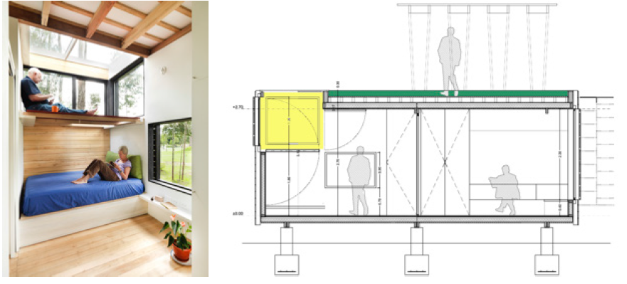 La captación solar necesaria para el calentamiento de la vivienda se obtiene mediante el diseño de un invernadero cuya situación puede observarse en la figura 13. Este se encuentra vidriado en dos de sus fachadas y su parte superior. Los tableros de la litera superior interceptan los rayos solares procedentes de múltiples orientaciones. El invernadero puede cerrarse en su perímetro y reducir de este modo las pérdidas de energía durante la noche provocadas por la radiación fría (espacial) y las bajas temperaturas (figura 13 y 14).