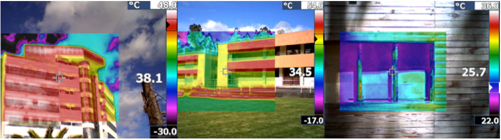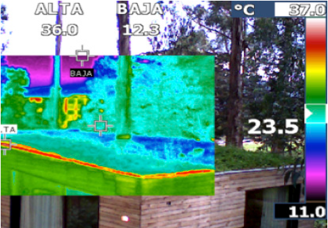 Para el análisis de la temperatura superficial de la cubierta y fachada del edificio se ha utilizado una cámara Fluke Ti25 dotada con corrector de emisividad, con una sensibilidad térmica de 0.1ºC a 30ºC para un rango de temperaturas de entre -20 y 350ºC y una precisión de 2ºC o el 2%. Se han realizado series de mediciones puntuales durante las horas de mayor y menor temperatura exterior, así como en periodos de máxima y mínima insolación diurna.