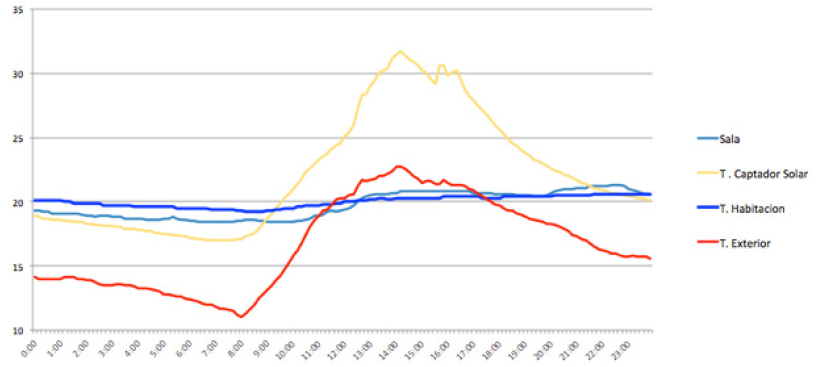 Del análisis comparativo de la temperatura interior y exterior se advierte la importancia de la combinación de aislamiento térmico, captación solar e inercia térmica. La temperatura exterior apenas supera la temperatura de confort durante 5 horas al día, lo cual pone de manifiesto la eficiencia del invernadero a la hora de calentar la vivienda. La estabilidad de la temperatura interior demuestra cómo la inercia térmica acumula de una manera conveniente dicha energía disipándola gradualmente a lo largo de la mañana, la tarde y la noche. A su vez, el mantenimiento de temperaturas de confort en el interior, a pesar de las bajas temperaturas nocturnas, demuestra la eficacia del aislamiento térmico aportado por la piedra pómez.