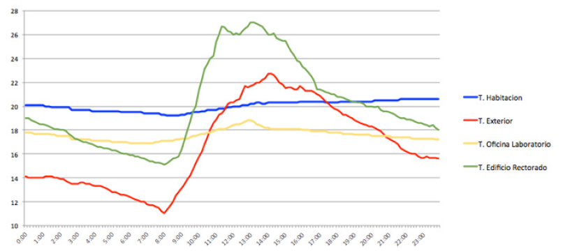 Los tres espacios presentan comportamientos muy diferentes (figura 22) . Mientras el edificio del rectorado presenta periodos de sobrecalentamiento y gran variabilidad de temperaturas interiores provocadas por la ausencia de una inercia térmica y la excesiva captación solar, el edificio de oficinas de los laboratorios del Departamento de Ingeniería Mecánica presenta un comportamiento totalmente distinto. Mantiene temperaturas estables, pero inferiores a las obtenidas en el prototipo E2 y a la temperatura de confort. La gran inercia térmica del sistema constructivo de hormigón mantiene la temperatura estable, pero la ausencia de aislamiento térmico y de energía captada por efecto invernadero provoca temperaturas interiores bajas, fuera de la zona de confort durante todo el día y la noche.