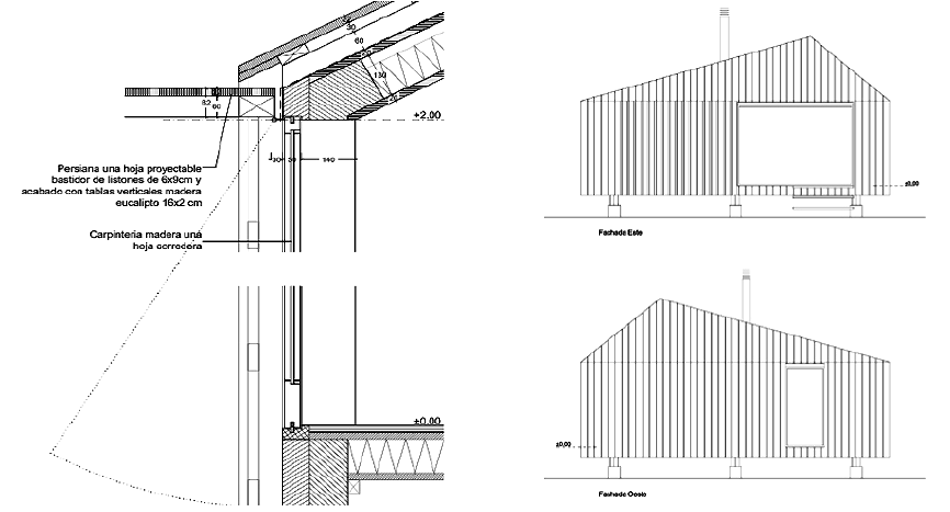 El sistema de fachada consiste en un revestimiento de tablas de madera local (laurel) separadas entre ellas 5 mm, y fijas a la pared interior aislada mediante chapa de galvanizado doblada en forma de Z de 12 cm de sección. De esta forma se obtiene una cámara de aire ventilada a modo de fachada pluvial que evita el humedecimiento de la fachada interior (que por lo tanto no requiere impermeabilización y se mantiene transpirable). La cámara de aire permite el secado perimetral de la tabla de madera exterior, reduciendo el riesgo de proliferación de hongos o pudrición de esta.