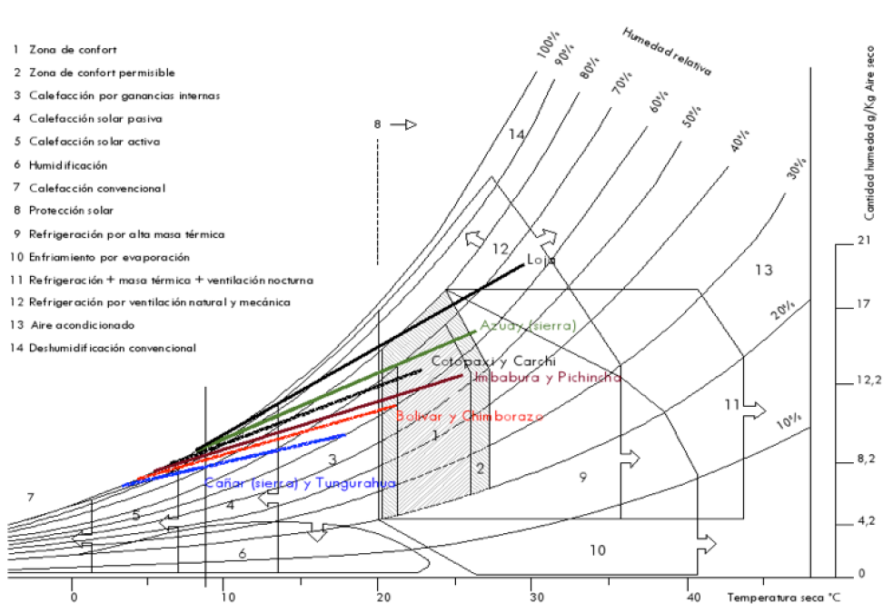 El régimen de temperaturas diarias es relativamente estable durante todo el año en toda la sierra. En el gráfico (figura 4) se observa como toda en todas las provincias de la región, las bajas temperaturas exigen la presencia de aislamiento térmico junto con algún tipo de sistema de calefacción. Por el contrario, no existen en la sierra problemas de altas temperaturas, a excepción de la provincia de Loja. Si existen en cambio problemas puntuales derivados de la alta radiación en donde se hará necesario el control de la radiación solar.