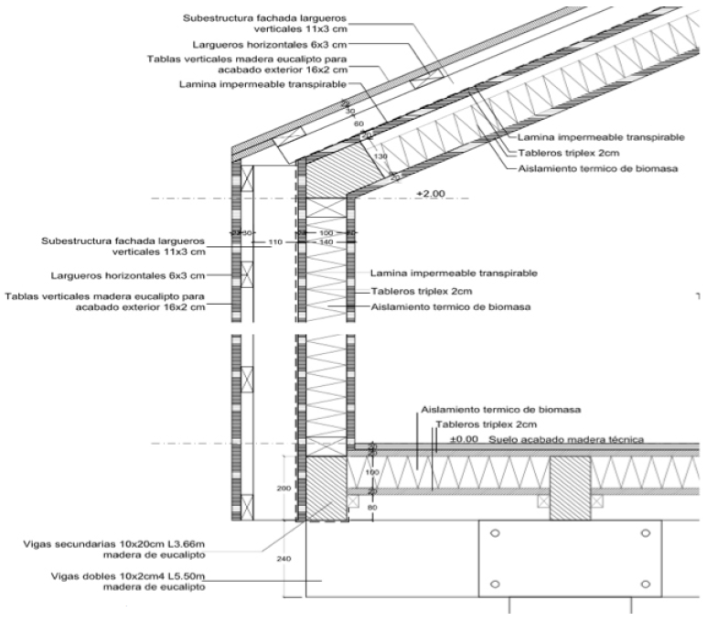 Con dicho objetivo se han desarrollado tres proyectos de edificio, válidos para el ámbito climático ecuatoriano, con la mínima huella ecológica y mayor cota de eficiencia energética. Concretamente el proyecto desarrolla la aplicación de aislantes térmicos naturales, una cubierta vegetal de bajo coste y un sistema de fachada ventilada, así como un sistema de captación de energía solar por efecto invernadero adaptado a latitudes ecuatoriales. El resultado de dicha investigación son los tres proyectos identificados como E1 (figura 1), E2 (figura 2) y E3 (figura 3) y la construcción y monitoreo de uno de ellos, el prototipo E2.