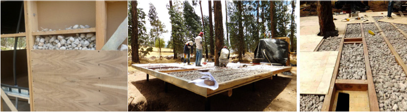 El interior de los bastidores de las paredes y entrevigado del suelo, de 13 y 15 cm de espesor respectivamente, se rellena de piedra pómez, quedando esta confinada por tableros contrachapados de 6mm de espesor. La piedra pómez será la encargada de aportar el necesario aislamiento e inercia térmica a la edificación (figura 10).