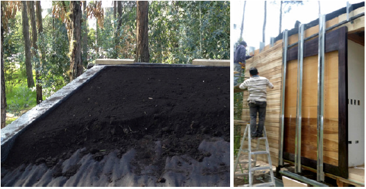 Los tres prototipos desarrollados cuentan con una cámara de entre 13 y 15 cm de espesor (confinada entre paneles de madera) que envuelve totalmente el espacio interior. Se pretende rellenar este intersticio en cada uno de los edificios con: raquis de palma (E1), piedra pómez (E2), y pajonal (E3). Las biomasas ensayadas se han seleccionado entre aquellas existentes en las regiones de implantación de los prototipos.