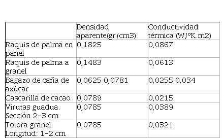 Compuestos encaminados a determinar las posibilidades de inclusión de los residuos de biomasa generados por los cultivos propios de cada área de Ecuador en elementos constructivos tales como: bloques, adobes, tapial o pisos de tierra estabilizados, paneles, mantas, etc. (Velasco, Delgado y Goyos, n.d.) se encuentran en fase final de evaluación por parte del Grupo de Energías Renovables del Departamento de Ciencias de la Energía y Mecánica en su carrera de Ingeniería Mecánica de la Universidad de las Fuerzas Armadas ESPE con resultados muy prometedores por sus bajas conductividades. Los resultados preliminares se resumen en la siguiente tabla (tabla 1).