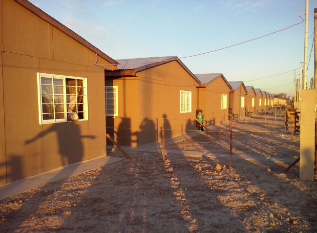 de las viviendas “definitivas” de ladrillo en construcción, y delante, a unos pocos metros de la entrada, una hilera de once casas prefabricadas que habían sido inauguradas tres semanas atrás. Las casas eran bastante amplias, de una planta, con techo de chapa a dos aguas. Sus paredes estaban pintadas de un tono ocre, lo que, junto al color de la tierra y a la luz rojiza de la tarde que caía, le daba al paisaje un aire desértico. Todas contaban con una pequeña puerta blanca de metal y dos ventanas. Y sobre el frente la numeración del 1 al 11 que permitía distinguir a viviendas idénticas.