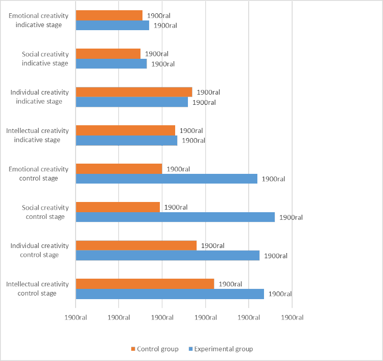 In the control group, the diagnostic indicators of intellectual creativity increased by 24.5%, individual creativity - by 4%, social creativity - by 6% and emotional creativity - by 5.7% compared to the diagnostic results at the indicative stage of the experiment.