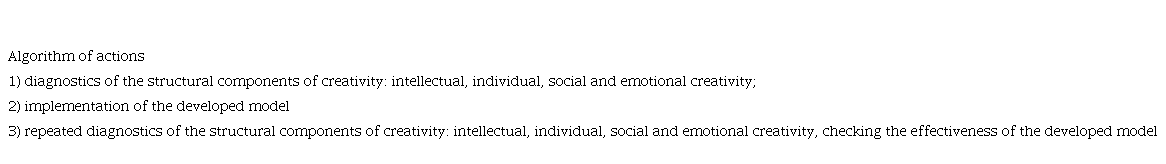 Thus, in order to implement the formation of professional creativity of teachers, it is necessary to develop an updated, personality-oriented model of teacher training, taking into account the systematic work on the development of creativity in the process of additional professional education programs using current methods of developing the declared parameter (FILIPPOVA et al., 2019; KOROTKOV, 2019; KRYUCHKOVA, 2018; KUZNETSOV et al., 2018; MAKAROVA, 2019; NARKEVICH; NARKEVICH, 2018; OSIPOVA, 2018; POPOV, 2018; SERGEEVA, 2019).