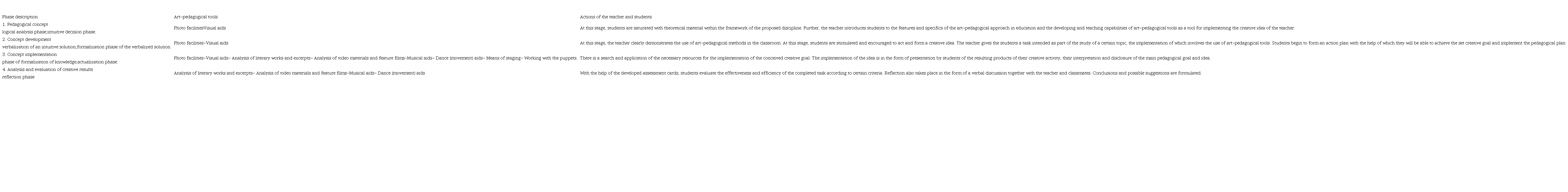 Having integrated the structure of pedagogical creative activity according to Kan-Kalik, the phases of intrapsychic mechanisms of the creative process according to Ponomarev and the structure of creative activity proposed by us, based on the generally accepted stages of creativity in psychology, we developed a model of art–pedagogical technology. A step-by-step description of the actions of participants in the educational process with the art-pedagogical tools used is presented in Table 2.
