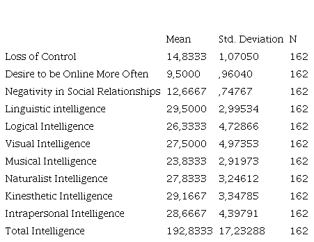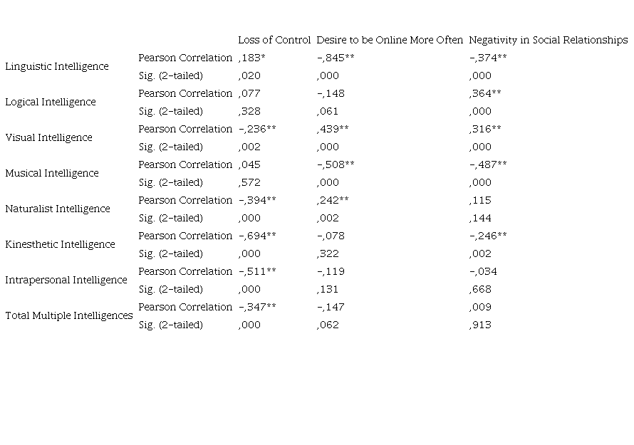 Because of the correlation analysis, it was determined that there was a positive relationship between linguistic intelligence and loss of control, and a negative relationship between the desire to be online more and the dimensions of negativity in social relations. It has been determined that there is a positive relationship between Logical Intelligence and the dimension of negativity in social relations. It has been determined that there is a positive relationship between Visual Intelligence and loss of control, and a negative relationship between the desire to be more online and the dimensions of negativity in social relations. It has been determined that there is a positive relationship between Musical Intelligence and the desire to be more online and the dimensions of negativity in social relations. It has been determined that there is a negative relationship between Naturalist Intelligence and the dimension of negativity in social relations. It has been determined that there is a negative relationship between Kinesthetic Intelligence and the dimensions of negativity in social relations, loss of control and the desire to be more online.