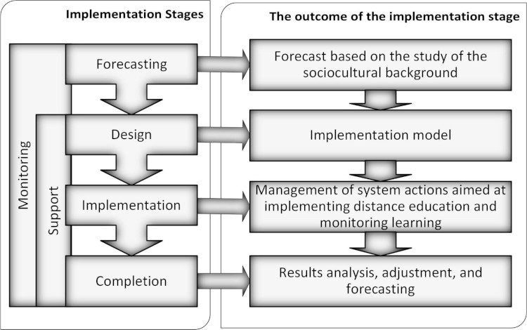 Figure 1 is a graphic representation of the model of implementing distance education, and it consists of two blocks: the stages of its implementation and the results of the implementation stages. The stages of implementation include forecasting, design, implementation, and completion, as well as midline: monitoring and support. Implementation results are the forecast based on the study of the sociocultural background, the implementation model, the management of the systemic events of distance learning and outcomes control, the analysis of outcomes, adjustment, and forecasting.