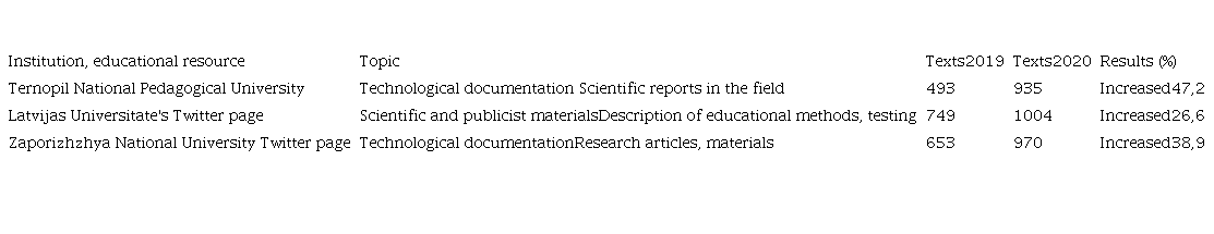 - training courses in a foreign language of professional direction on educational platforms, the main parameters of Twitter, Telegram, Facebook;