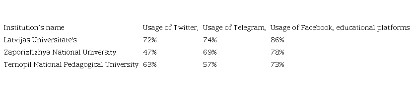 As the surveys showed, some students (5%) who studied at universities in Ukraine noted that they could not study fully. After all, they could not use ICT facilities because their localities had poor or no Internet coverage at all. It is this situation that may explain the lower results than in Latvia (by 10% on average).