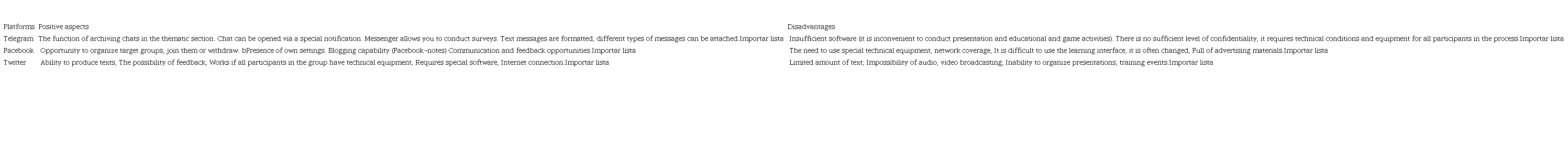 In the pedagogical experiment were also used the training and communicative possibilities of public and educational platforms, learning resources convenient for the post-Soviet countries (Ukraine, Latvia). Such platforms were chosen, were popular among users, declared an interest in the preparation of materials for the distance learning of foreign languages, foreign language of professional direction.