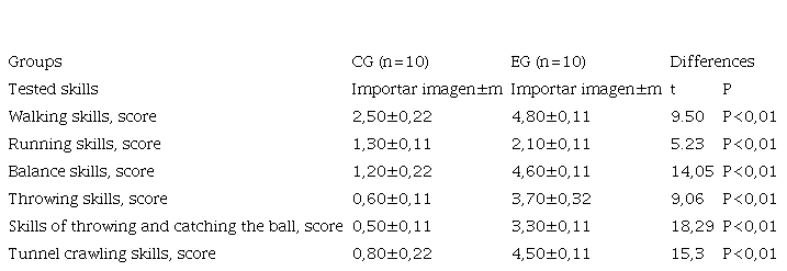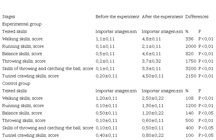 In the children of the experimental group, during the lessons, the greatest increase was revealed in the indicator of skills of throwing and catching the ball. The result improved from 0.1 points to 3.3 points (3200 %) (P<0.01). The second biggest improvement was in the crawling through the tunnel skills. The average score for the group increased from 0.2 points to 4.5 points (2150 %) (P<0.01). By the end of the experiment, the kids were already crawling through a two-meter children's tunnel on their own, while some were holding a toy in their hand, while others were pushing the ball in front of them. No less significant results were obtained for other tested skills. In the control group, improvements occurred in all indicators, except for the skills of crawling through the tunnel (P>0.05). The highest increase was found in the indicator of running skills, the results increased by an average of 1200 % (P<0.01) (Table 1).