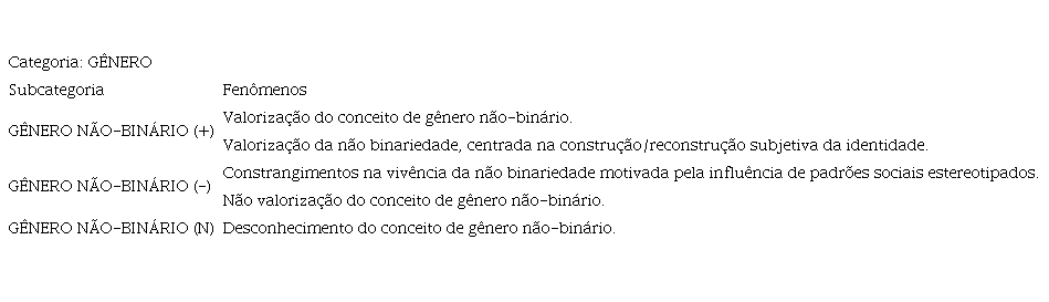 Considerou-se que “Gênero” seria a categoria principal que inclui o gênero não-binário. Analisando as respostas dos participantes obteve-se três subcategorias: a primeira subcategoria “Gênero não-binário (+)” aglomerou os fenêmenos: valorização do conceito de gênero não-binário; valorização da não binariedade, centrada na construção/reconstrução subjetiva da identidade. A segunda subcategoria, designada de “Gênero não-binário (-)” reuniu os fenêmenos considerados não positivos tais como: constrangimentos na vivência da não binariedade motivada pela influência de padrões sociais estereotipados; não valorização do conceito de gênero não-binário. A terceira subcategoria “Gênero não-binário (N)” refere-se ao desconhecimento do conceito de gênero não-binário.