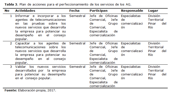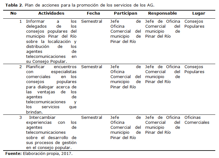 A ello responde la propuesta que se presenta para accionar en los Consejos Populares con los Agentes de Telecomunicaciones, de forma tal que le permita a la empresa satisfacer necesidades básicas de los clientes y tener un punto de presencia en la comunidad donde radican los mismos.