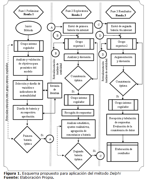 En el presente caso, para utilizar el método Delphi, se empleó una serie de fases mostradas en la figura 1, las cuales están basadas en el estudio de diversas publicaciones acerca del método ( Landeta, 2006; Skulmoski, Hartman & Krahn, 2007; Acuña, 2013 & Martínez-del-Vas, 2014).