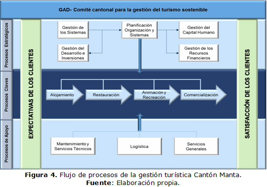 Para comprender los flujos, las entradas y salidas del proceso turístico, así como los procesos fundamentales otorgadores de valor agregado a los satisfactores de las necesidades y expectativas de los clientes, los autores desarrollaron un mapa de flujos de proceso de la actividad turística de las costas de Manabí, figura 4, que responde en niveles de subordinación al Departamento de Turismo que es un actor del comité cantonal y se subordina al Gobierno autónomo descentralizado de cada cantón costero de Manabí. Esta estructura de subordinación concibe las necesidades actuales que requiere el desarrollo de la actividad turística desde la gestión sostenible y teniendo en cuenta la multidimensionalidad y las sinergias Inter actorales a los procesos claves de la actividad.