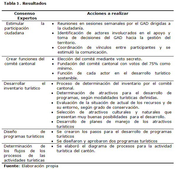 Las aportaciones consensuadas de los expertos coinciden en señalar, que el sector turístico en cantones costeros mejorará de manera considerable al aplicar el modelo de gestión del turismo sostenible. El consenso de expertos considera que se debe crear un comité cantonal con funciones generales para gestionar el turismo local. Asimismo, el implementar un sistema de indicadores multidimensional, que la gestión deba constituir en una herramienta para los Gobiernos Autónomos Descentralizados en la conducción del turismo sostenible en función del aprovechamiento de los recursos endógenos y exógenos y la articulación de actores locales.