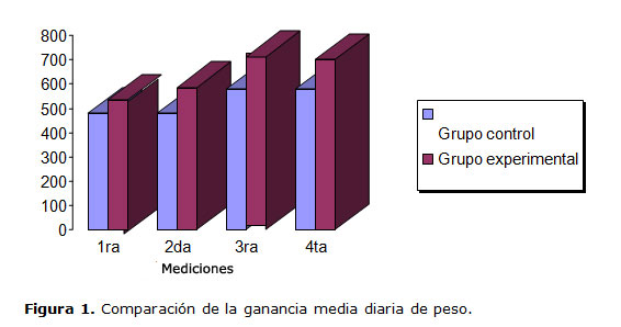 El grupo control sostuvo una ganancia media de peso diaria en las dos primeras mediciones de 480 g/animal/día. Estos resultados correspondieron con una etapa poco lluviosa (marzo y abril). Luego, llegaron a alcanzar valores de 580 g/animal/día en las mediciones efectuadas en el periodo lluvioso. Este incremento, de unos 100 g/animal/día, pudo estar favorecido por la mayor disponibilidad de pastos en dicha etapa. Por su parte, el grupo experimental en las dos mediciones realizadas durante el periodo de escasez de pastos naturales logró una ganancia media diaria de 533 y 586 g/animal/día, respectivamente, cifras que ascendieron a 713 y 701g/animal/día en las determinaciones correspondientes al período de lluvias.