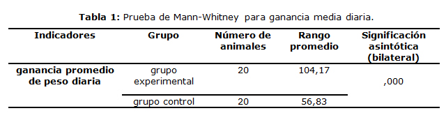 Al analizar los resultados del experimento para evaluar el efecto de Saccharomyces cerevisiae en la ganancia de peso media diaria se pudo constatar una diferencia bioestadística significativa (P<0,05) al comparar este parámetro con el brindado por los animales del grupo control ( Tabla 1).