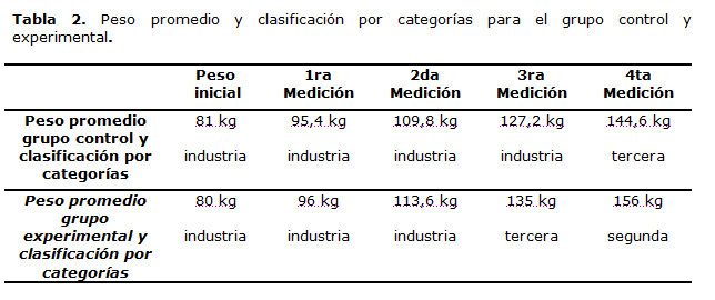 Aunque todos los animales partieron de una condición de terneros sanos de industrias, a partir de la tercera medición hubo un avance favorable en este sistema de clasificación en el caso del grupo experimental. Así pues, el grupo control evoluciona a lo largo del experimento y termina en la categoría de 3ra en la última medición, mientras que el grupo experimental con un mejor desempeño, culmina en la categoría de 2da ( Tabla 2).