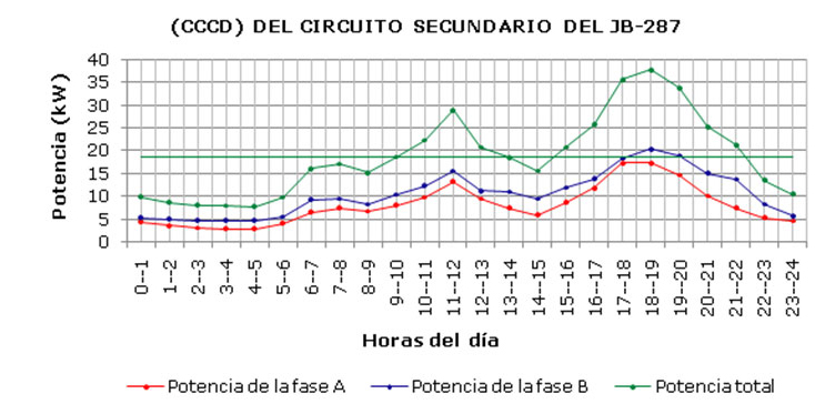 La figura 1 representa la CCCD, perteneciente al circuito secundario del JB-287. Como se observa el tipo de carga es residencial pues tiene los tres picos de demanda característicos: el de la mañana, el del mediodía, y el de la noche. Horarios de mayor consumo de energía en los hogares.