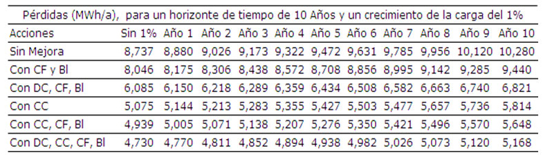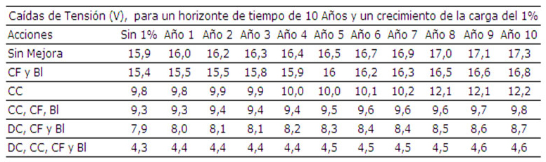 Para evaluar el efecto derivado de representar las acciones propuestas por el software se incorporaron dos nuevos factores en las corridas de flujos, un crecimiento esperado de la carga del 1 % para un horizonte de tiempo de 10 años, los resultados se muestran en la tabla 1.