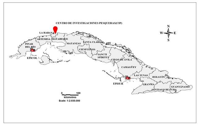 Para el estudio del área productiva, fueron escogidas la Empresa Pesquera La Coloma (EPICOL) y Santa Cruz del Sur (EPISUR), por ser empresas líderes en el sector y encontrarse ubicadas en ambas zonas geográficas (este y oeste del país). Se utilizó el Centro de Investigaciones Pesqueras (CIP) por considerarse la institución de investigación por excelencia ( Figura 1).