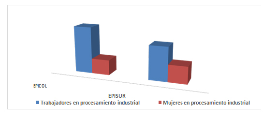 En la Figura 2se observa detalladamente la representatividad de la mujer en ambas empresas pesqueras, apreciándose que es significativa su presencia en el resultado productivo, siendo, la cantidad de mujeres en EPISUR superior a la reflejada en EPICOL, lo cual puede deberse a la diversificación de las producciones y/o a la existencia de puestos de trabajo que permitan una mayor incorporación de las fuerzas femeninas.