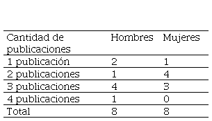 Para analizar la producción científica, se elaboró una tabla que mostraba el comportamiento de hombres y mujeres según la cantidad de publicaciones por cada sexo. Los resultados en la Tabla 1, permitieron constatar que la mayoría de los investigadores tienen 3 publicaciones y que no existieron diferencias en cuanto a la producción científica total por sexo.