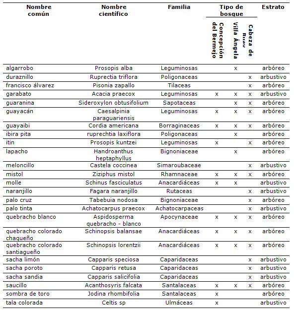 En el bosque ?Concepción del Bermejo? fueron halladas 11 especies pertenecientes a 7 familias botánicas; en el bosque tipo ?Villa Ángela? se encontraron 13 especies y 9 familias y en el bosque tipo ?cabeza de buey? se relevaron 20 especies y 14 familias.