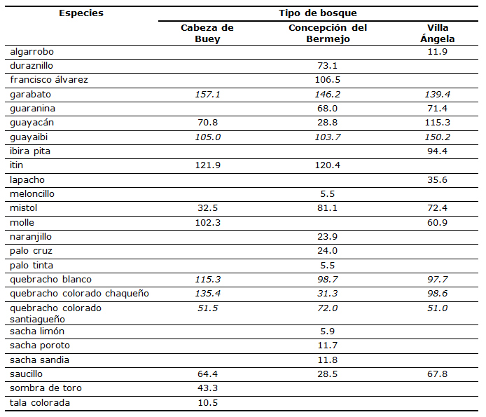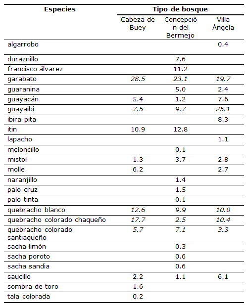 Según la Tabla 1, la mayor cantidad de especies arbóreas se registraron en el bosque de Cabeza de Buey con 13 especies, seguido por Villa Ángela con 11 especies, mientras que en el bosque de Concepción del Bermejo se registraron 9.