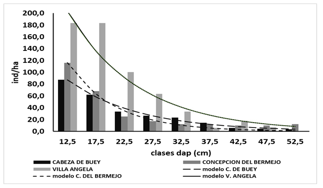 Claramente se observa en la Figuraque tanto los modelos ajustados como las frecuencias por clase diamétricas reflejan una estructura de tipo irregular para los tres tipos de bosque estudiados, pudiendo diferenciarse en términos de densidad dos situaciones por un lado el bosque de Villa Ángela y por el otro los bosques de Concepción del Bermejo y Cabeza de Buey, ambos típicos del Chaco semiárido.