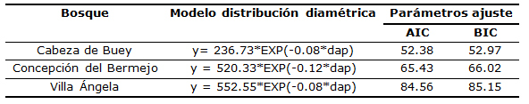 En términos estadísticos los modelos ajustados de la Tabla 4, reflejan satisfactoriamente la distribución diamétrica de los tres tipos de bosque, se destaca el mayor valor de la constante que presenta el bosque de Villa Ángela, no obstante, la pendiente es igual a la del bosque de Cabeza de Buey. Indicando en este caso que el flujo de individuos en términos relativos entre las distintas clases diamétricas es igual, mientras que para el bosque de Concepción del Bermejo sería un poco más acelerado.