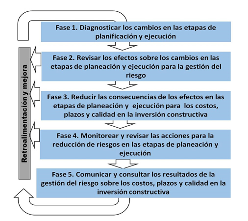 Fase 1. Diagnosticar los cambios en las etapas de planeación y ejecución: en este apartado, la relación de causalidad es importante. Se trata de conocer los cambios que se producen en las fases de planeación-control. La gestión del riesgo dentro de esta fase precisa los límites. La utilización de técnicas y herramientas para gestionar los riesgos se basa en evidencias, análisis cuantitativos y cualitativos que enfocan la estrategia entorno a criterios. Ejemplo de ellos se tienen: el método de criterio de Prouty; el método de criterio de gravedad o financiero para los riesgos clasificados como cualitativos; y los análisis de diagramas de flujos; entrevistas; análisis de sensibilidad para la ocurrencia de riesgos cuantitativos. Estos últimos pueden medirse en el tiempo, y a su vez puedan mejorarse. En esta fase fue posible identificar si algunos de los componentes de los riesgos cualitativos forman parte de la responsabilidad social empresarial de algunas de las partes interesadas comprometidas con la inversión constructiva y que pone en peligro la ejecución. Para ello se analizaron los niveles de identificación e involucramiento en los cambios ocurridos. Se evaluó el reconocimiento de la problemática y la responsabilidad de los actores implicados a través de técnicas como las listas de verificación, clasificaciones y taxonomías; análisis: modal de fallos y efectos; modal de fallos, efectos y su criticidad.