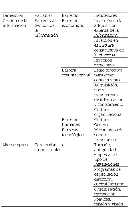 Se aplicó el Alfa de Cronbach para determinar la validez y confiabilidad del instrumento aplicado (encuesta), el resultado obtenido fue de 0.9074, por lo que el instrumento de medición tuvo una correlación significativa y la validez fue adecuada para el objetivo del estudio. Las variables e indicadores ( Tabla 1), utilizados para la evaluación de las barreras y acciones que inciden en la gestión de la información para la toma de decisiones de los pequeños y medianos negocios constituyeron la base para el instrumento de medición.