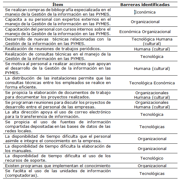 A través de la prueba de hipótesis se constató que la adquisición, uso y transformación del conocimiento en las PYMES depende de las barreras de la gestión de la información. Se concluye que debido al tipo de empresa de la que se trata (Pymes), ellas no están familiarizada con la gestión de la información. Aunque se realicen algunas actividades relacionadas con los procesos de la gestión de la información, se hace sin conciencia y sin estrategias definidas para mejorar la productividad.