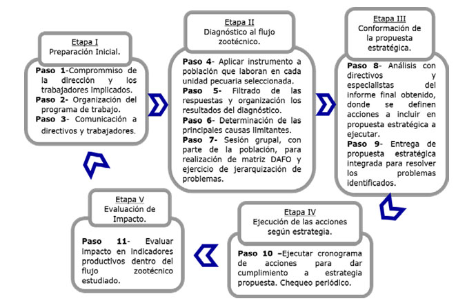 La metodología para diseño de estrategia en la actividad ganadera con ineficiencia productiva ( Figura 1) consta de 5 Etapas las que a su vez contienen 11 pasos, que facilitan la aplicabilidad de la misma.