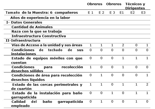 En este paso se extraerán por ítem diagnosticado en cada unidad productiva que conforma el flujo zootécnico, aquellas respuestas evaluadas de Mal (0), las que serán clasificadas como las principales limitantes que afectan el flujo zootécnico para esa unidad. Posteriormente se buscará coincidencias de ítems con igual clasificación en las restantes unidades que conforman el estudio, para tener consenso de cuáles son las principales debilidades existentes en el flujo.