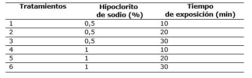 Tratamientos de desinfección: los explantes se lavaron con detergente comercial al 1 % durante 5 minutos, luego se enjuagaron tres veces con abundante agua. Seguidamente, y dentro de la cabina de flujo laminar, se sumergieron en distintas concentraciones de hipoclorito de sodio y tiempos de exposición ( Tabla 1).