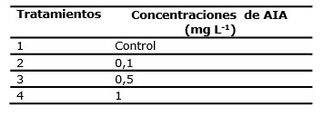 La Tabla 5 muestra que, el tratamiento con 0,5 mg L -1 a los 30 días posee el mayor porcentaje de plántulas enraizadas con la aparición de raíces pequeñas a partir de los 10 días de cultivo con diferencias significativas respecto al resto de los tratamientos. Mientras que los tratamientos con 0 y 0,1 mg L -1 de AIA no mostraron diferencias significativas, esto puede ser atribuido a la no presencia (control) y baja concentración de AIA utilizado. La respuesta que tuvieron los explantes en presencia de 1 mg L -1 de AIA sugiere que no fue adecuada para conseguir resultados satisfactorios en esta especie ya que el desarrollo de las raíces podría ser afectado por altas concentraciones de auxinas en el medio de cultivo, que unido a las concentraciones endógenas del explante produce un aumento de la concentración de esta auxina, la cual actúa a bajas concentraciones, observándose una disminución de los valores para todos los indicadores, ya que la concentración de la hormona es determinante del crecimiento. Este resultado podría estar dado a una respuesta a la aplicación de auxina para controlar el exceso de auxina libre, que puede estar regulada por el aumento de la concentración endógena del AIA ( Gray et al., 2014).