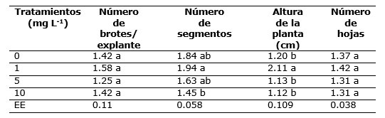 Las concentraciones de AG 3 utilizadas en este estudio no ejercieron un efecto estadísticamente significativo en las variables: número de brotes/explante y número de hojas ( Tabla 4). Con relación al indicador número de segmentos/ explante, no existió diferencias significativas entre las concentraciones de AG 3 estudiadas en relación al tratamiento control, aunque existió diferencias significativas entre las concentraciones de 1 y 10 mg L -1. El mayor valor correspondió a la concentración de 1 mg L -1, con 3,33 segmentos por explante. En cuanto al indicador altura de la planta, se observaron diferencias significativas entre la concentración de 1 mg L - 1 con relación al control y al resto de las concentraciones evaluadas.