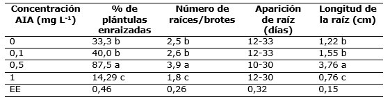 De forma general los resultados alcanzados en este experimento indican como mejor tratamiento el correspondiente a la concentración 0,5 mg L -1 de AIA, con lo cual se promovió el enraizamiento hasta un 87,5 %, así como el número (3,9) y longitud de las raíces (3,76 cm) lo que podría repercutir sobre el aumento del vigor de los explantes y facilitar la aclimatación directa de las plantas producidas in vitro.