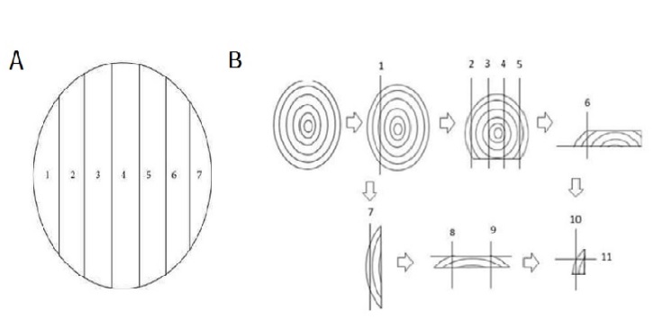 Debido a la particularidad del Eucalyptus sp en cuanto a las elevadas tensiones internas de crecimiento y sus posteriores defectos en la madera aserrada se aplicaron a las muestras dos esquemas de aserrado, denominados (a)- aserrado tangencial con cortes sucesivos y el (b)- aserrado tangencial con cortes alternativos, tal y como son representados en la Figura 1; coincidiendo con Carvalho, Rocha, Timofeiczyk et al. (2019).